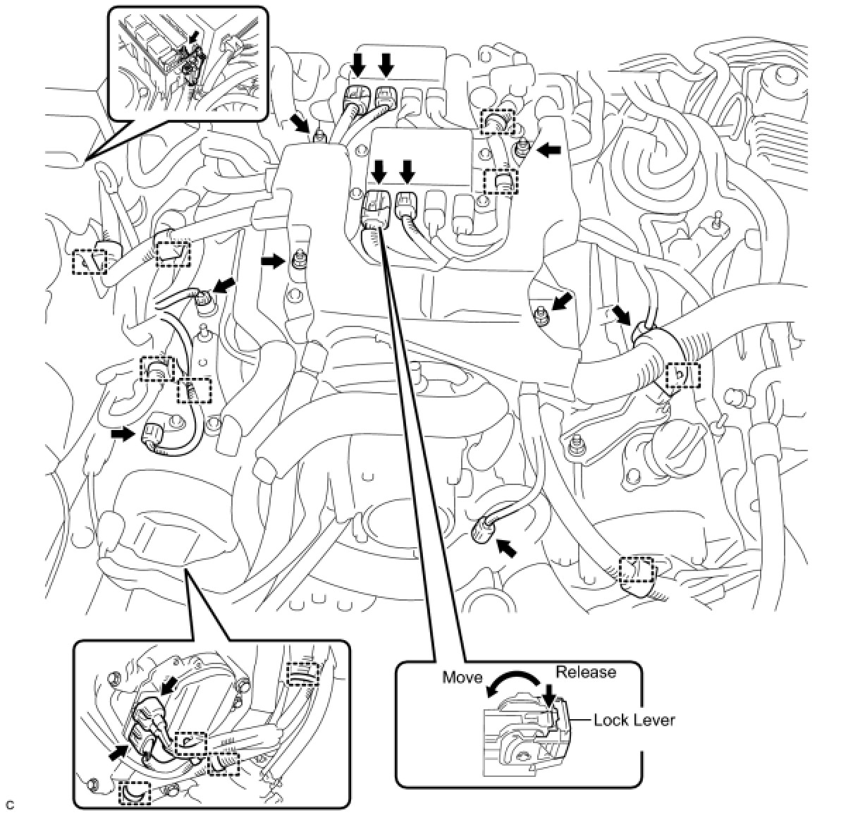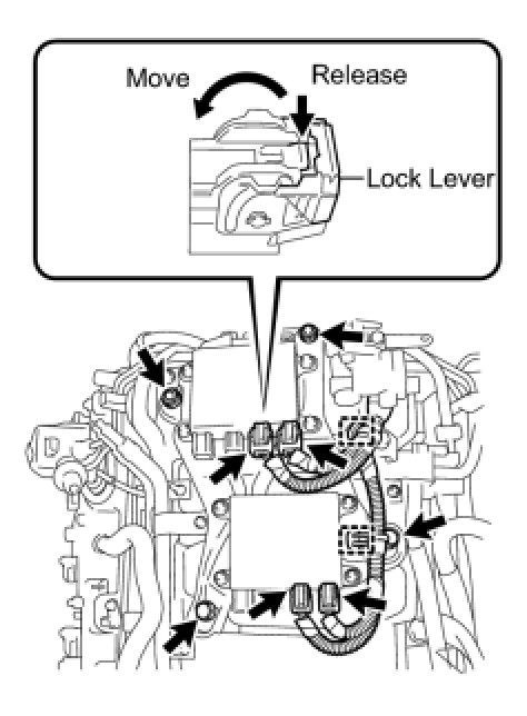 To disconnect the injector driver connectors, push the claw downward and move the lock lever to release the lock.