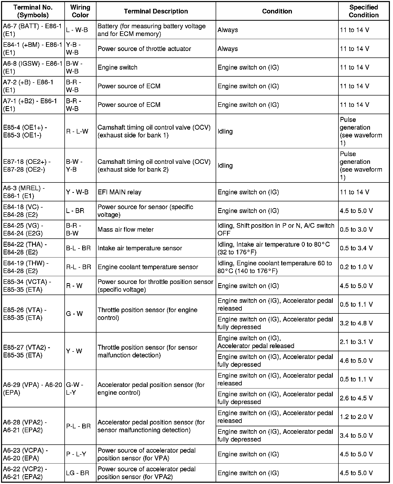 The standard normal voltage between each pair of the ECM terminals is shown in the table below. The appropriate conditions for checking each pair of the terminals are also indicated. The result of checks should be compared with the standard normal voltage for that pair of terminals, displayed in the Specified Condition column. The illustration above can be used as a reference to identify the ECM terminal locations.