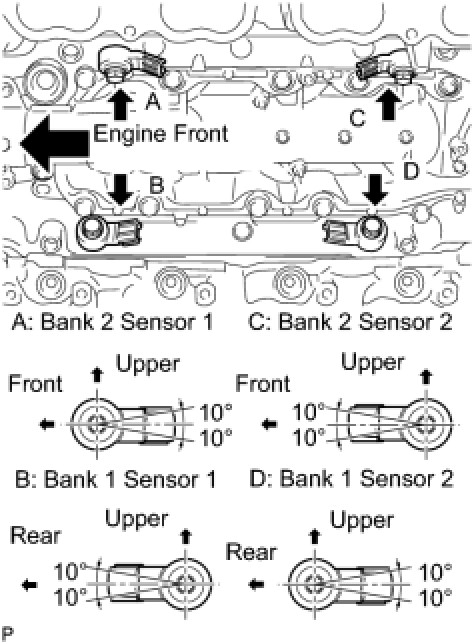 (a) Install the 4 knock sensors with the 4 bolts so that the sensors are angled as shown in the illustration.