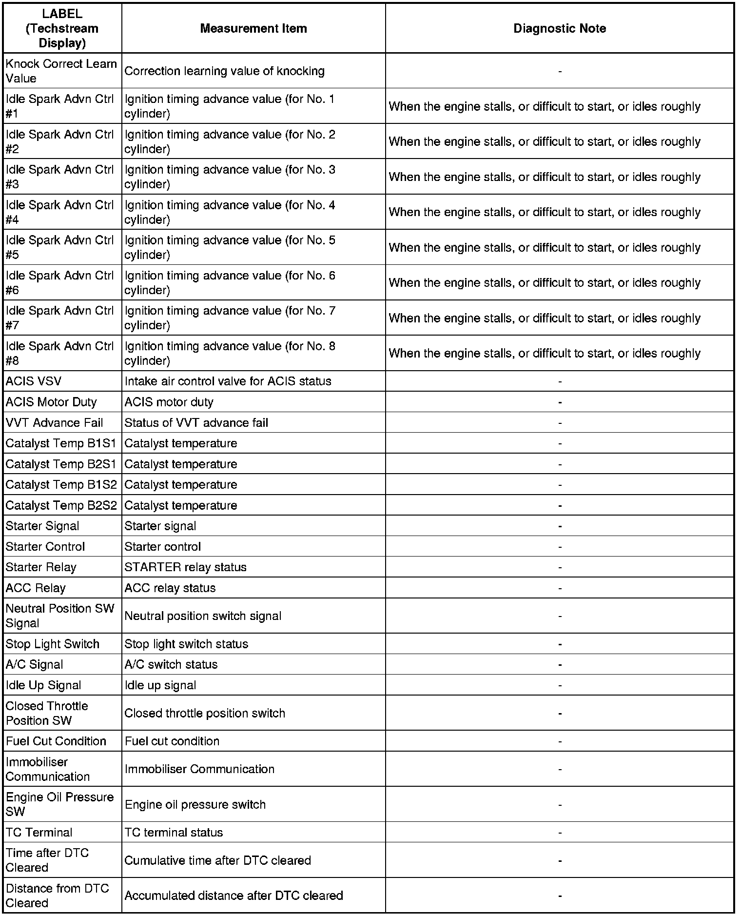 The ECM records engine conditions in the form of freeze frame data every 0.5 seconds. Using the Techstream, five separate sets of freeze frame data, including the data values at the time when the DTC was set, can be checked.