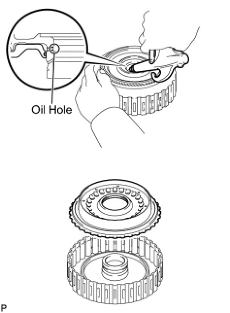 (d) Hold the overdrive direct clutch piston and apply compressed air to the oil hole of the overdrive direct clutch drum to remove the overdrive direct clutch piston sub-assembly.