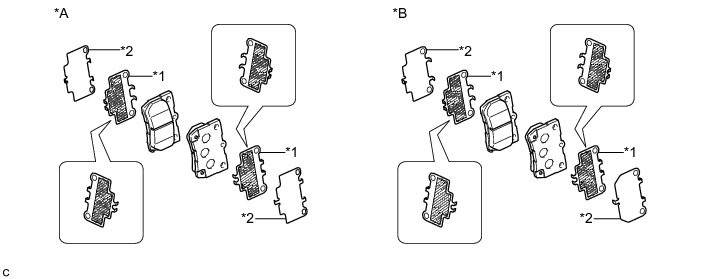 (b) Install the No. 1 anti-squeal shim and No. 2 anti-squeal shim to each brake pad.