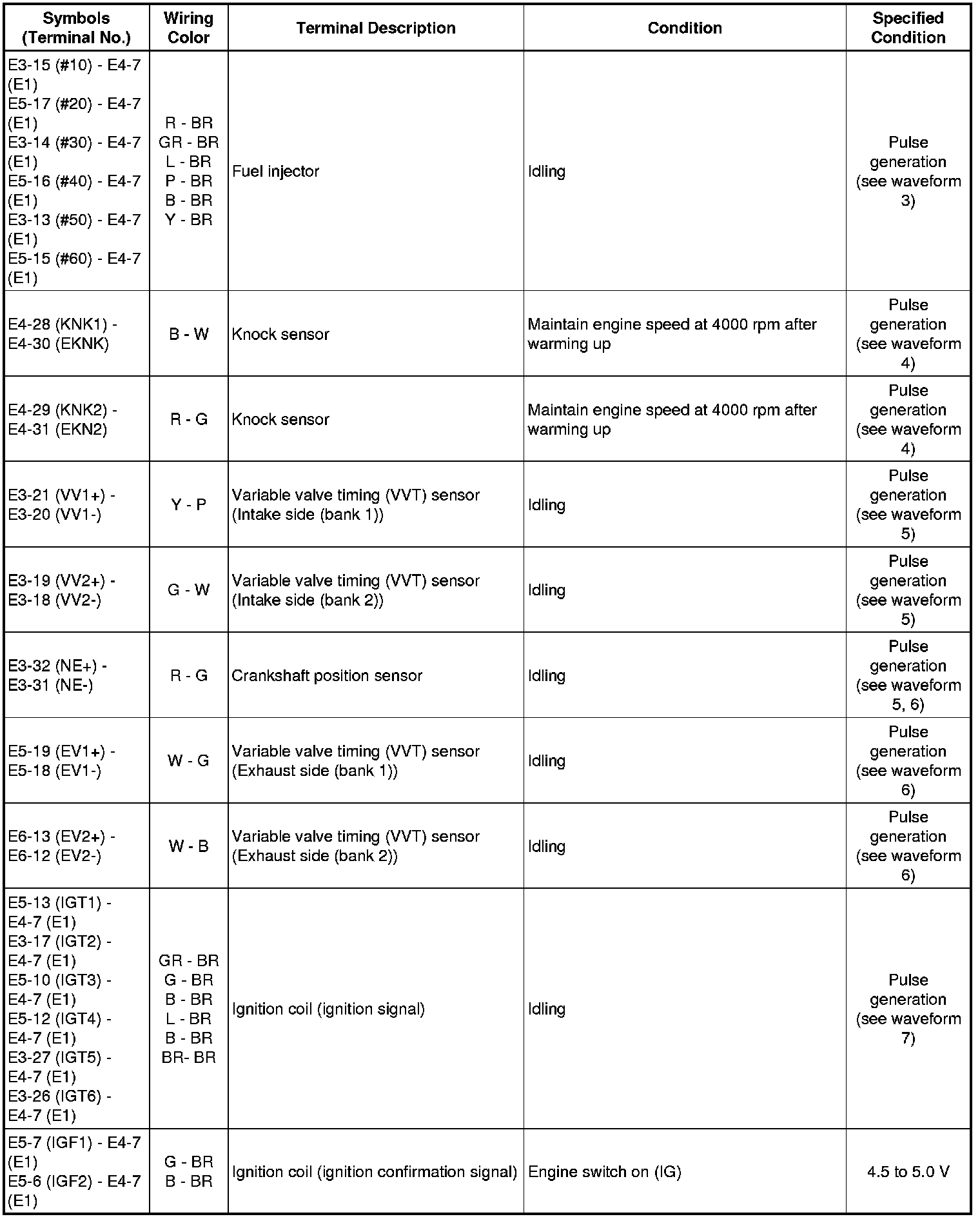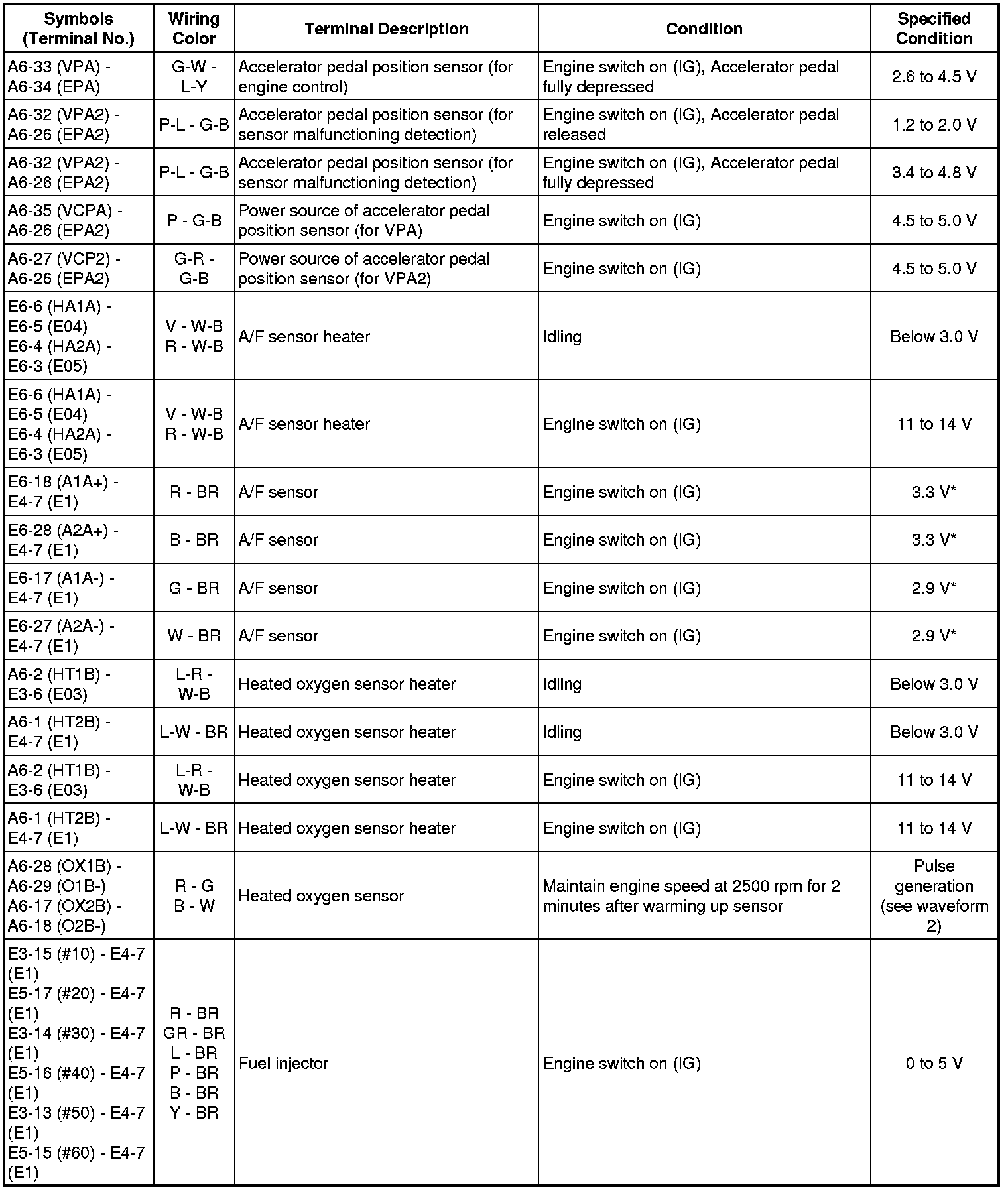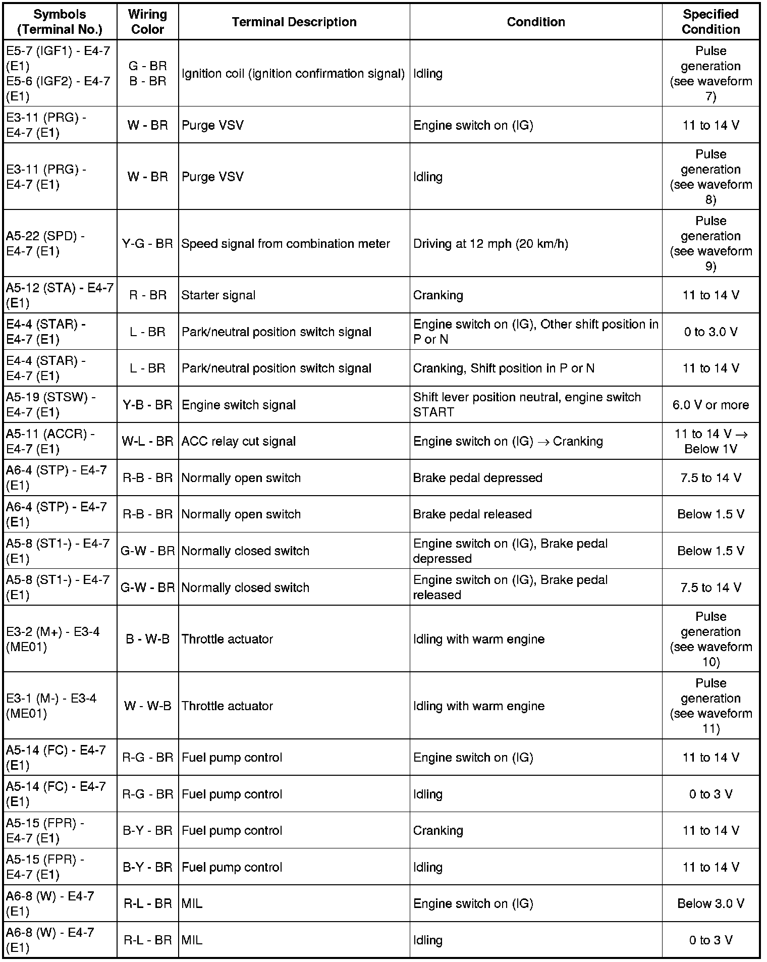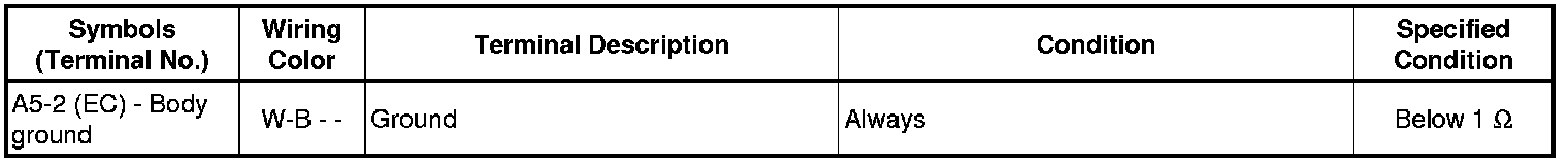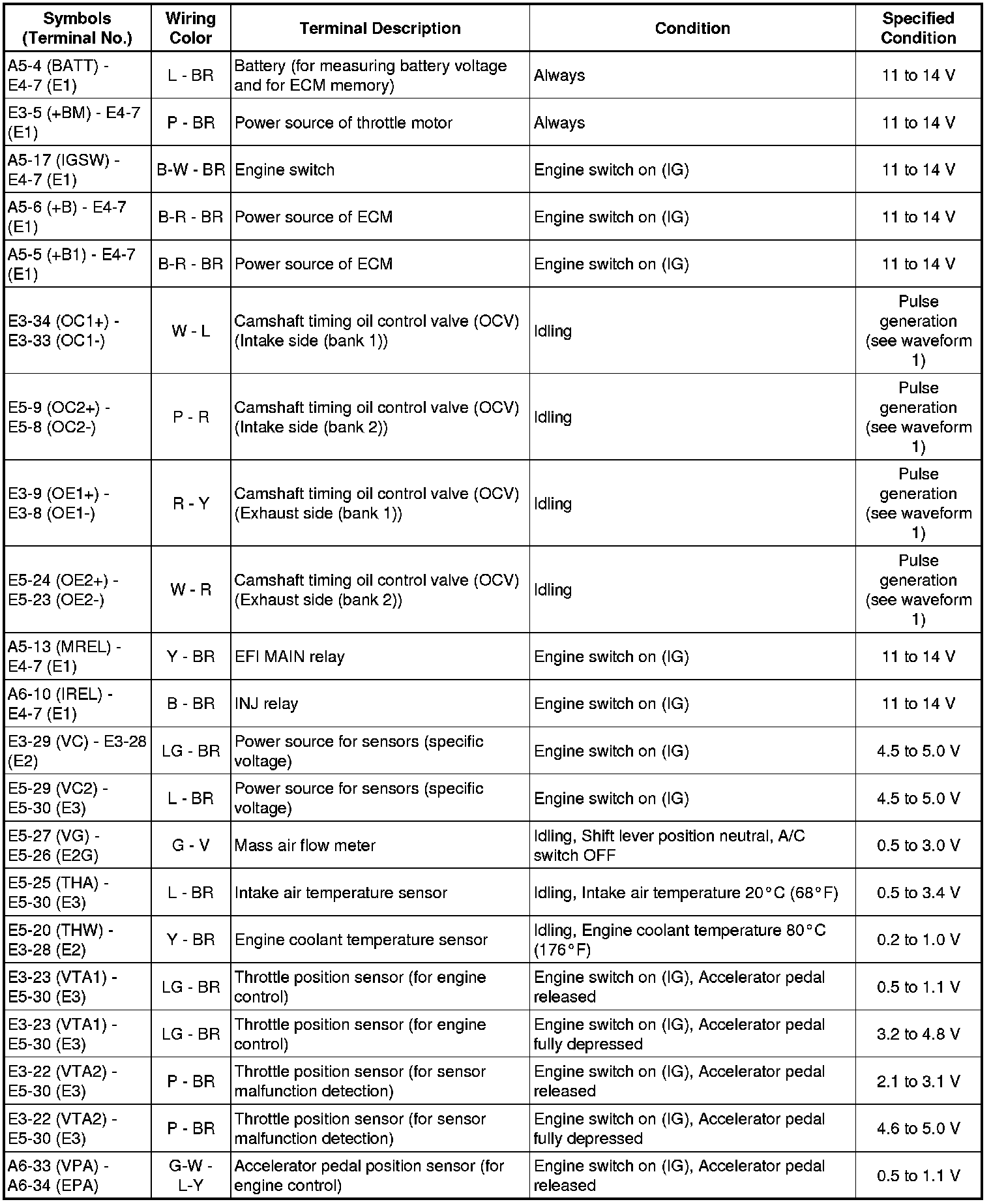 The standard normal voltage between each pair of the ECM terminals is shown in the table below. The appropriate conditions for checking each pair of the terminals are also indicated. The result of checks should be compared with the standard normal voltage for that pair of terminals, displayed in the Specified Condition column. The illustration above can be used as a reference to identify the ECM terminal locations.