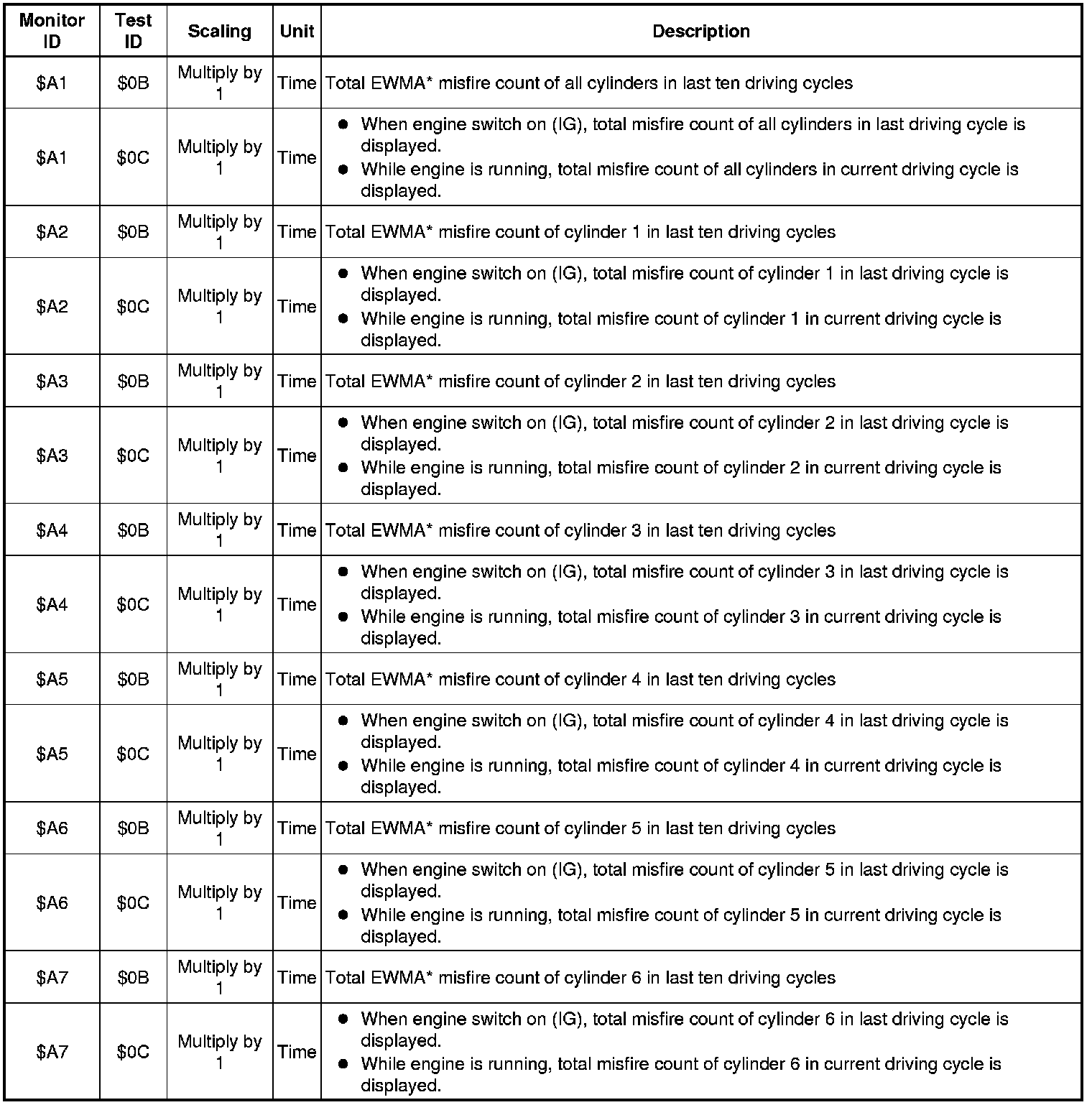 *: EWMA (Exponential Weighted Moving Average) misfire counts for last 10 driving cycles (calculated) Calculation: 0.1 x (current counts) + 0.9 x (previous average) Initial value for (previous average) = 0