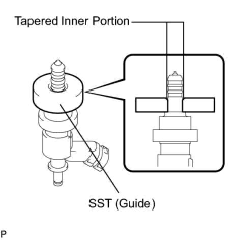 (b) Apply engine oil to the injector contact surface of SST (guide). Then attach SST (guide) to the injector with the tapered inner portion facing the tip of the injector, as shown in the illustration.