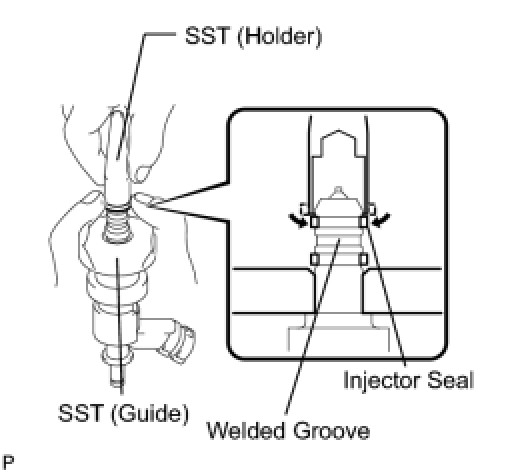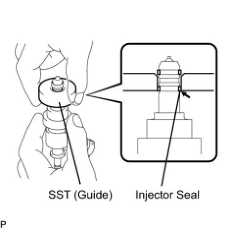 Be careful that the seal is not pinched between SST (guide) and the injector groove. Replace the seal if it becomes damaged.