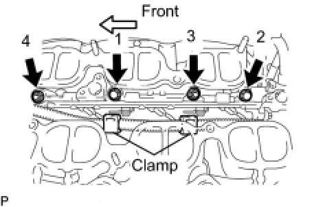(d) Install the fuel delivery pipe by uniformly tightening the 2 bolts and 2 nuts in several passes in the order shown in the illustration.