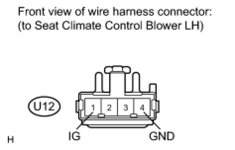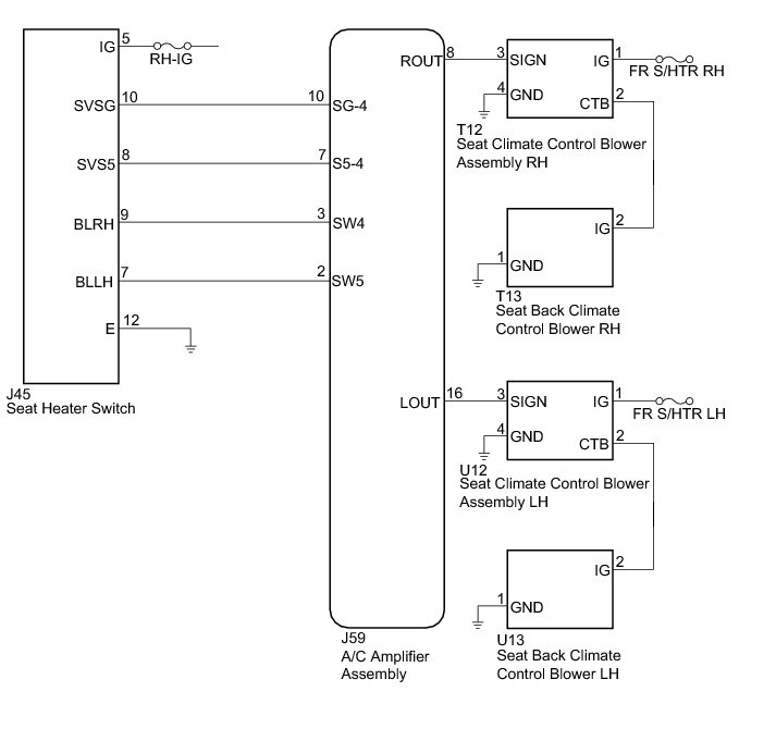 The A/C amplifier assembly receives seat heater switch position signals when the engine switch is on (IG), and then transmits airflow amount signals to each seat climate blower.