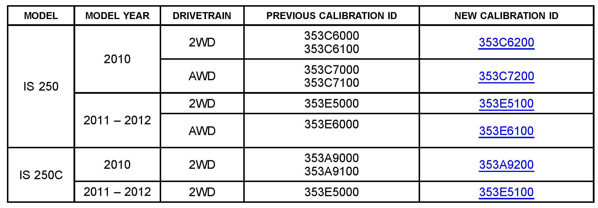 Some 2010 - 2012 model year IS 250 and IS 250C vehicles equipped with automatic transmissions may exhibit a MIL "ON" condition with Diagnostic Trouble Codes (DTCs) P014C, P014D, P014E, or P014F present. The Engine Control Module/ECM (SAE term: Powertrain Control Module/PCM) logic has been modified to reduce the possibility of this condition occurring. Use the following procedure to reprogram the ECM (PCM).