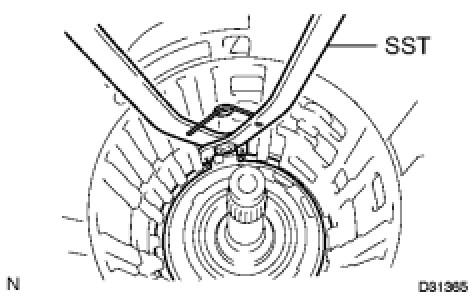 (c) Using SST, a screwdriver and a press, install the No. 2 brake spring snap ring.
