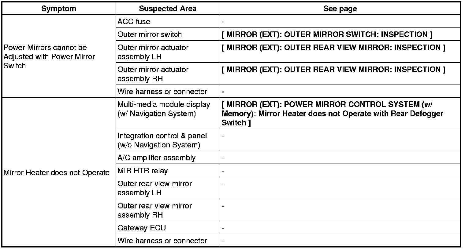 MIRROR (EXT): POWER MIRROR CONTROL SYSTEM (w/o Memory): PROBLEM SYMPTOMS TABLE