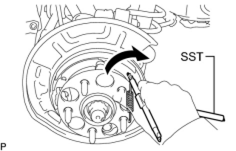 (a) Using SST, remove the No. 2 parking brake shoe return tension spring.