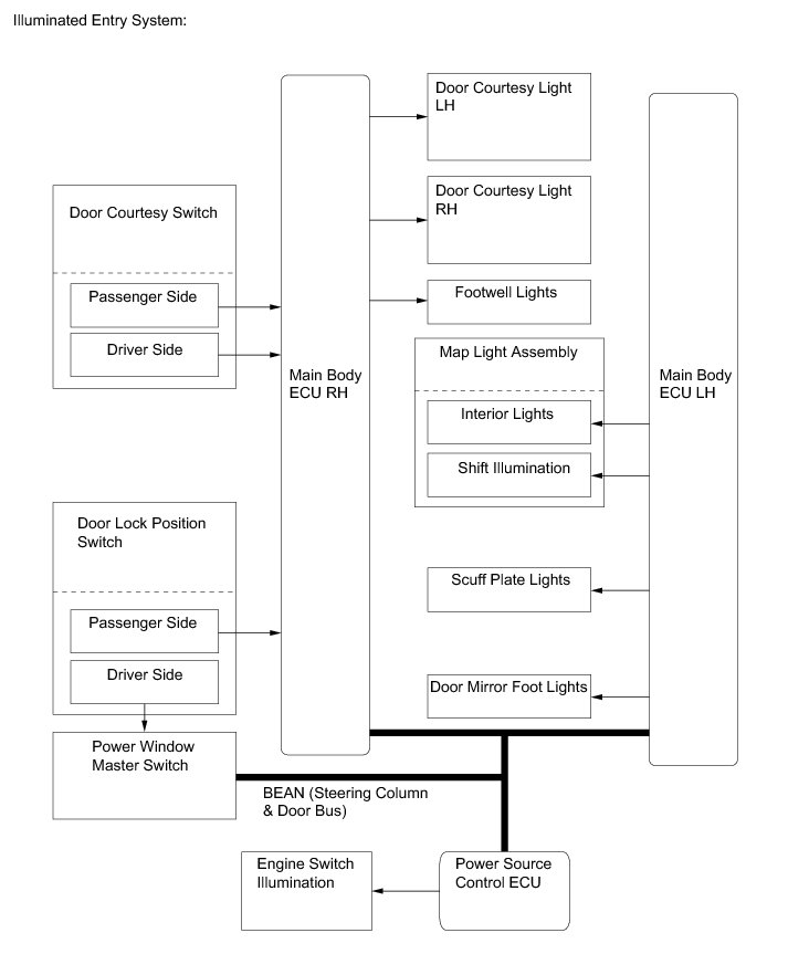 Various switches or sensors are represented as inputs for the different systems mentioned in the section. Where direct electrical connections do not exist between components, signals may be carried across the different networks (BEAN, CAN) that exist on the vehicle. If a signal needs to travel from a CAN system to a BEAN system, the gateway ECU allows the signal to travel between these different networks. Some of these different signals can be confirmed or inspected using the Techstream.