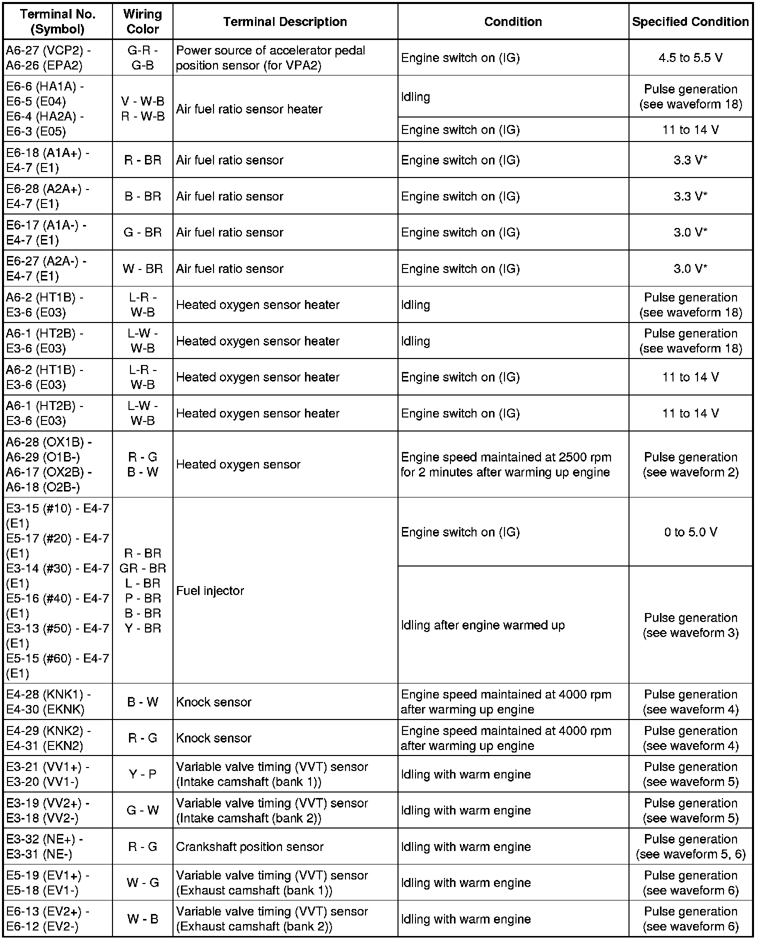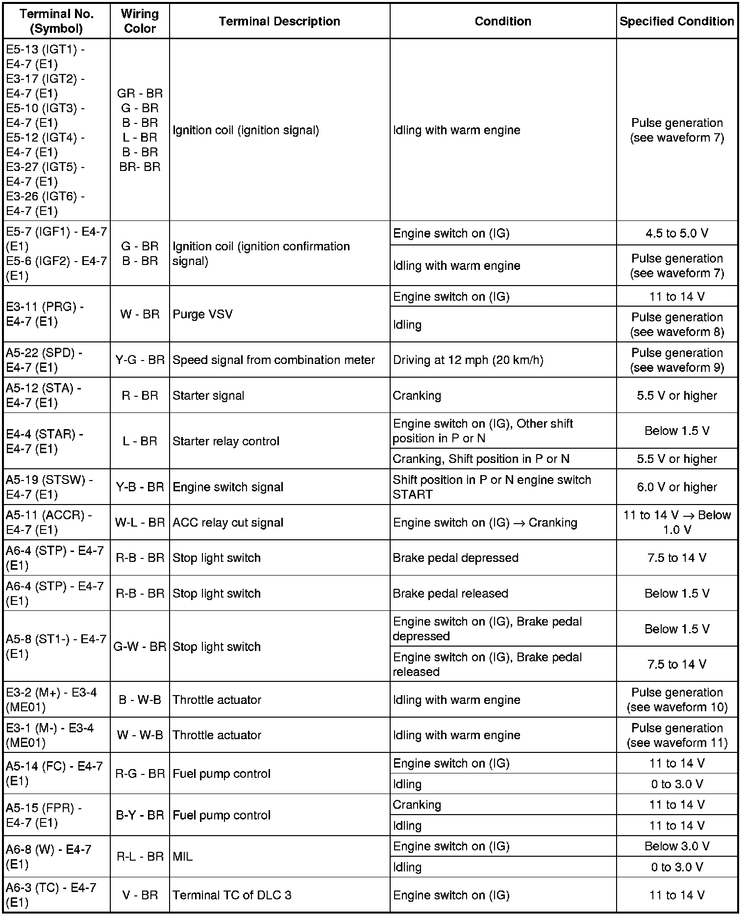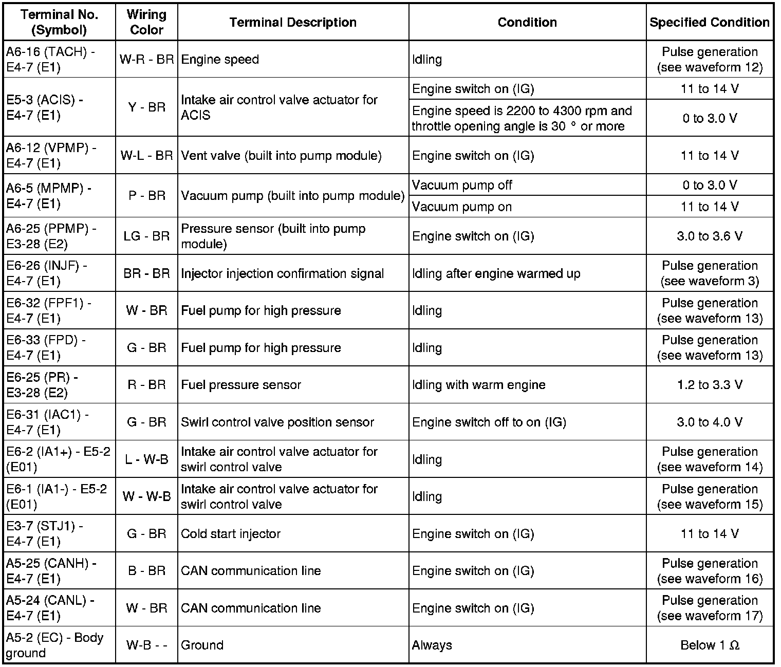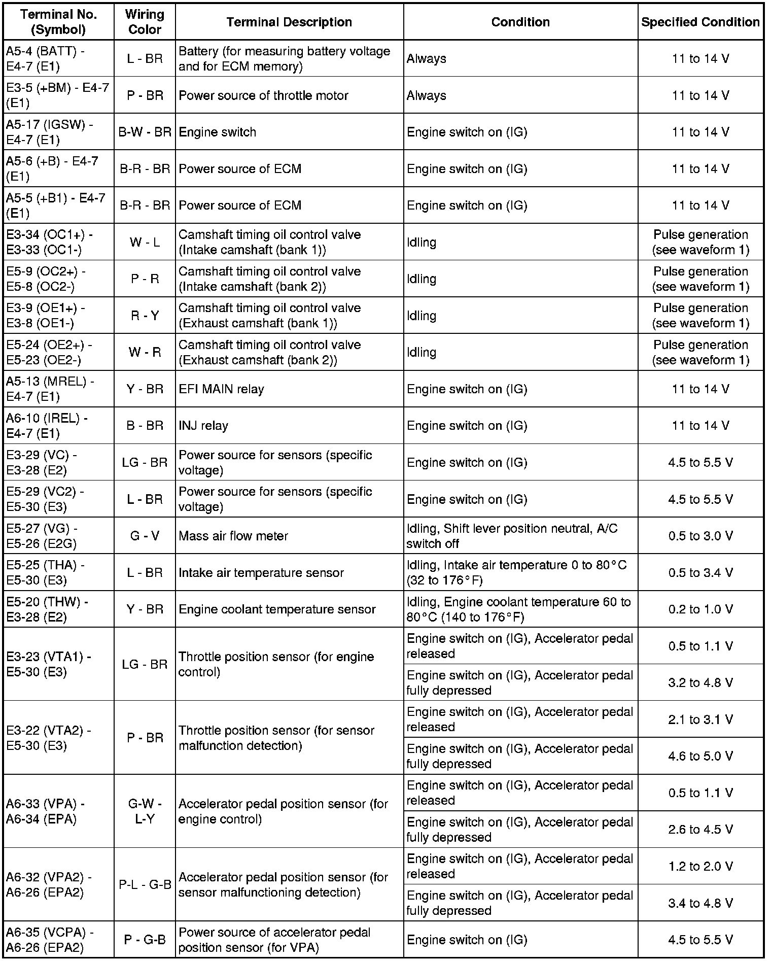 The standard normal voltage between each pair of the ECM terminals is shown in the table below. The appropriate conditions for checking each pair of the terminals are also indicated. The result of checks should be compared with the standard normal voltage for that pair of terminals, displayed in the Specified Condition column. The illustration above can be used as a reference to identify the ECM terminal locations.