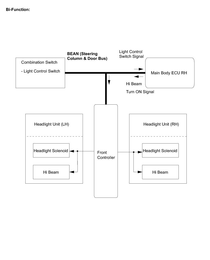 The main body ECU RH and front controller control this system. The main body ECU RH transmits a turn ON signal to the front controller, and the front controller illuminates the high beams using duty control.