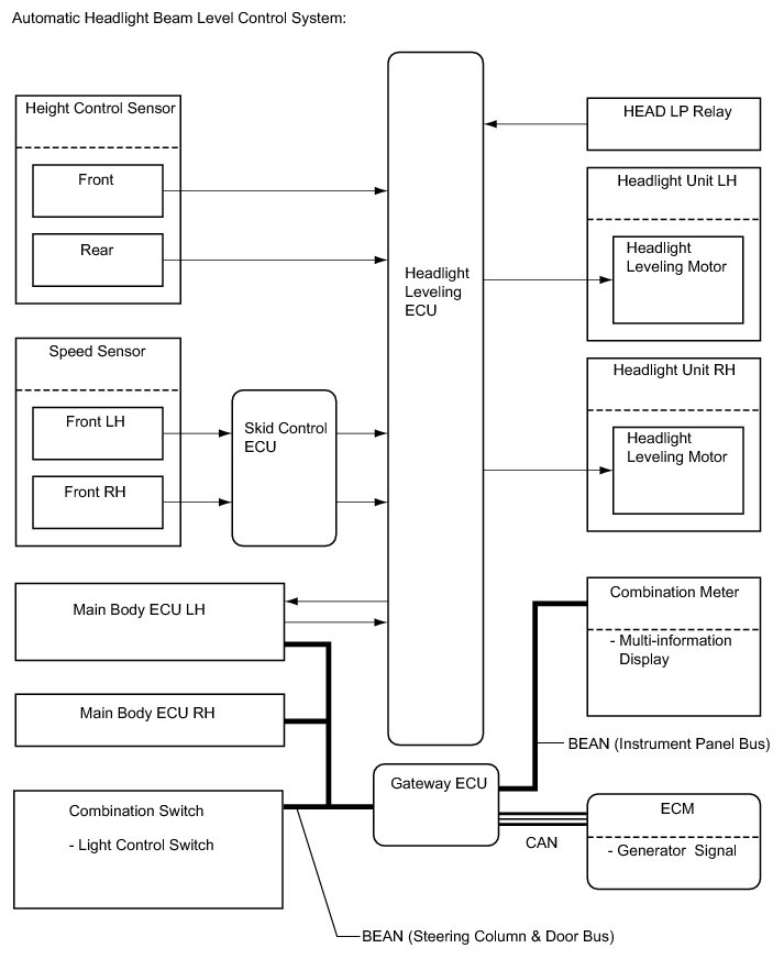 The automatic headlight beam level control system mainly consists of the headlight leveling ECU assembly, front height control sensor, rear height control sensor, and two headlight level actuators. The headlight leveling ECU assembly controls the system.