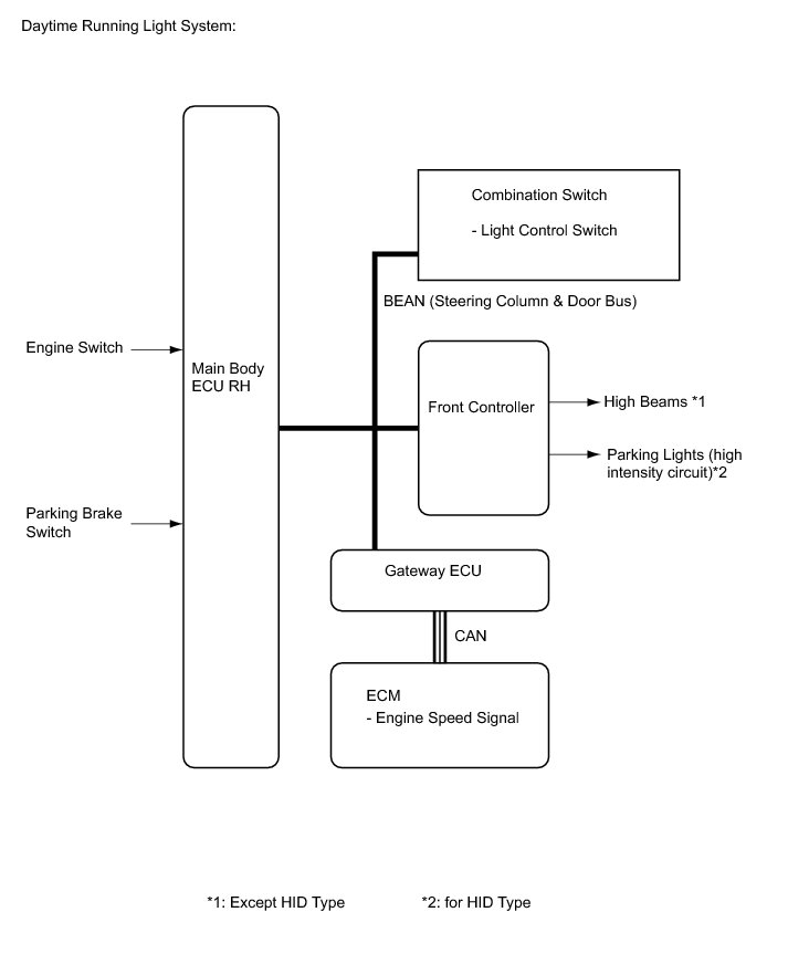 The main body ECU RH and front controller control this system. The main body ECU RH transmits a turn ON signal to the front controller, and the front controller illuminates the high-intensity parking lights.