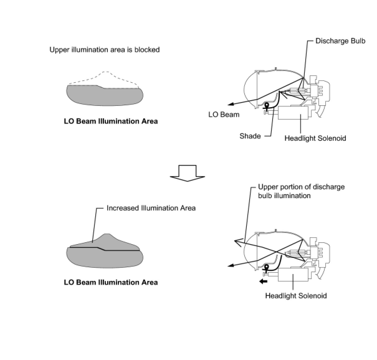 If the low beam is selected, the upper illumination area of the discharge bulb is blocked by a shade and only the lower illumination area is used. If the high beam is selected, the headlight solenoid slides the shutter (shade) down to allow use of the upper illumination area, thus increasing the illumination area and improving visibility when the high beam is on.
