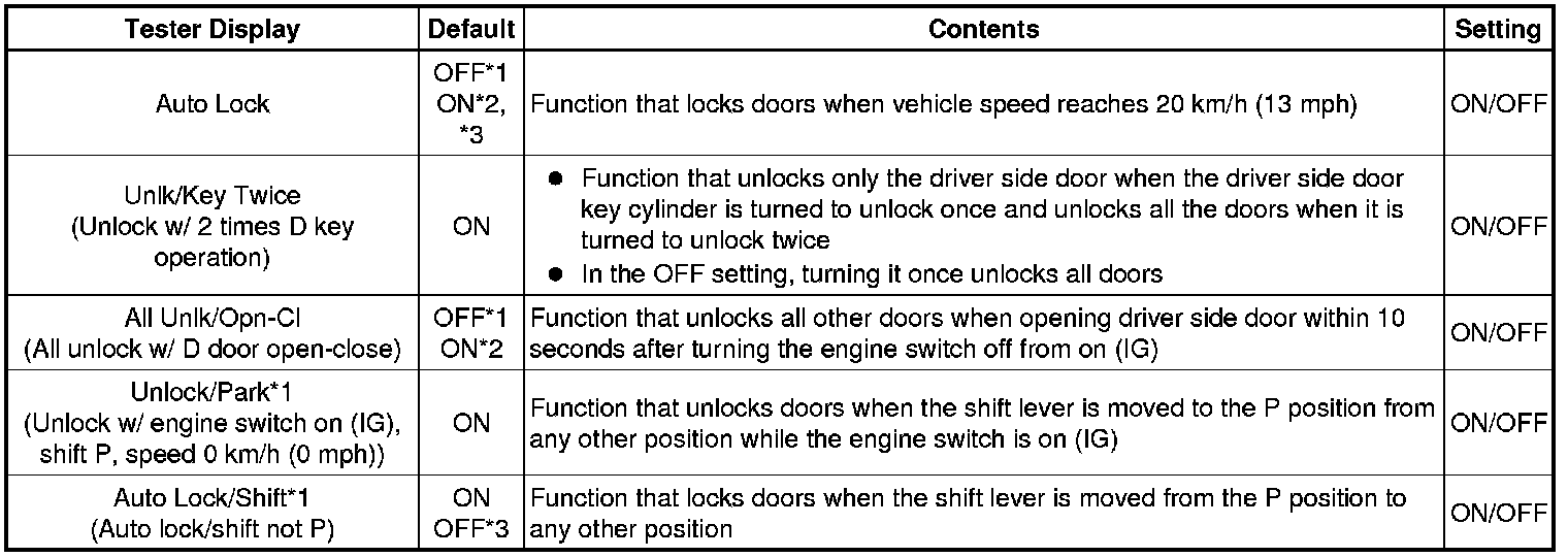 *1: This function is linked with the power window key-linked function. If the power window key-linked function is set to OFF, the sliding roof key-linked function will not operate even when it is set to ON.