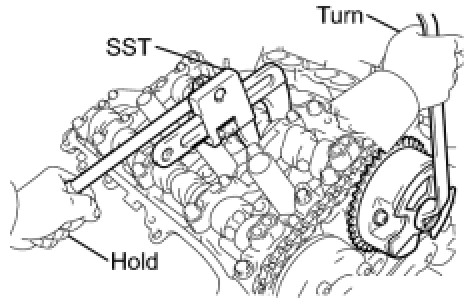 (a) Turn the crankshaft counterclockwise 10° to loosen the chain of the crankshaft timing sprocket.