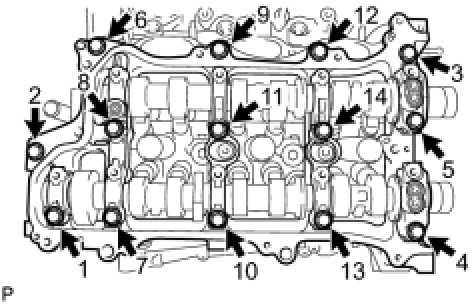 (c) Uniformly loosen and remove the 14 bearing cap bolts in the sequence shown in the illustration.