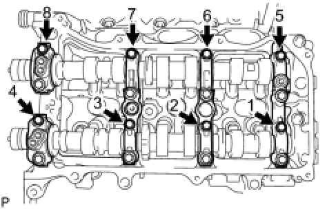 (b) Uniformly loosen and remove the 8 bearing cap bolts in the sequence shown in the illustration.