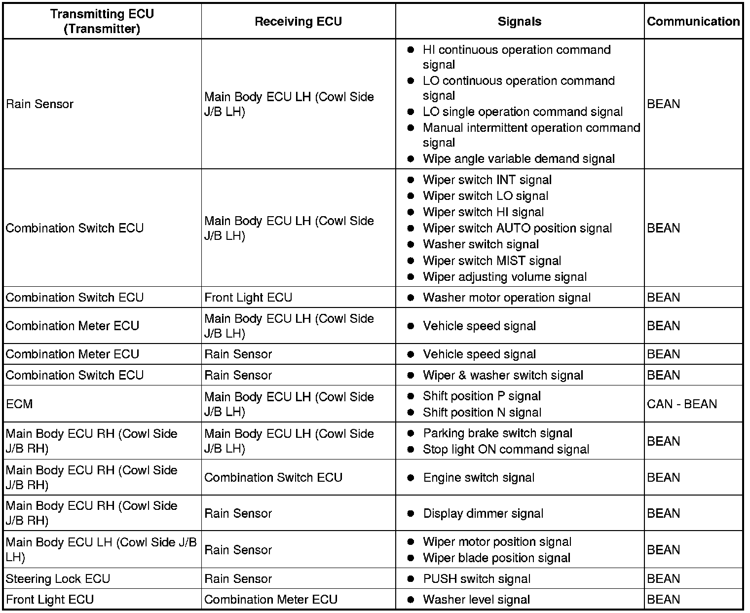 (e) The washer switch operation signal transmitted by the combination switch ECU is received by the main body ECU LH.