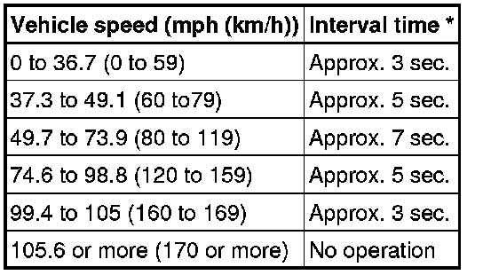 (2) As shown in the following chart, after the end of this operation, the wiper operates once more. It does so after an interval time (between 3 to 7 seconds) determined based on the vehicle speed so that any washer fluid drips are wiped away. The speed signal used for this function is sent by the combination meter, and received by the main body ECU LH.