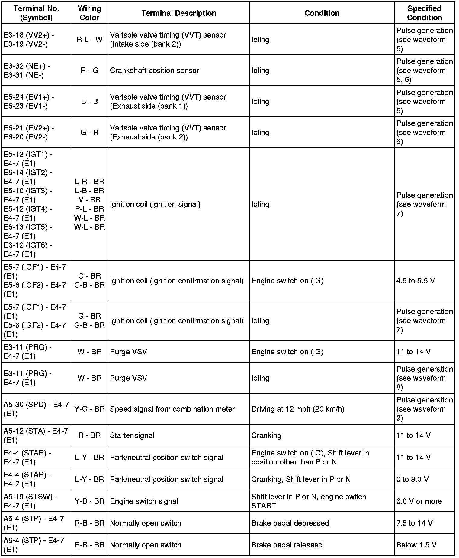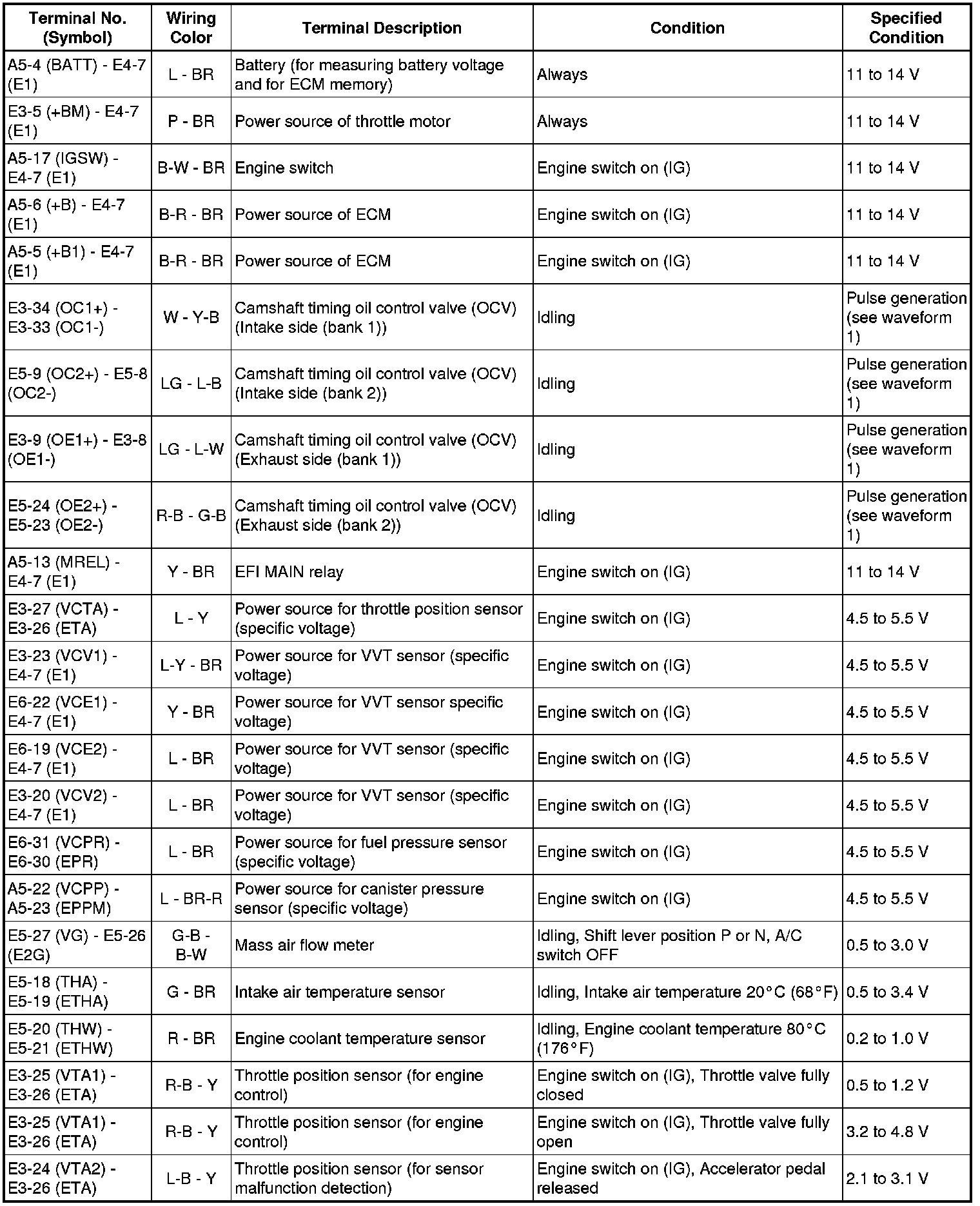 The standard normal voltage between each pair of the ECM terminals is shown in the table below. The appropriate conditions for checking each pair of the terminals are also indicated. The result of checks should be compared with the standard normal voltage for that pair of terminals, displayed in the Specified Condition column. The illustration above can be used as a reference to identify the ECM terminal locations.