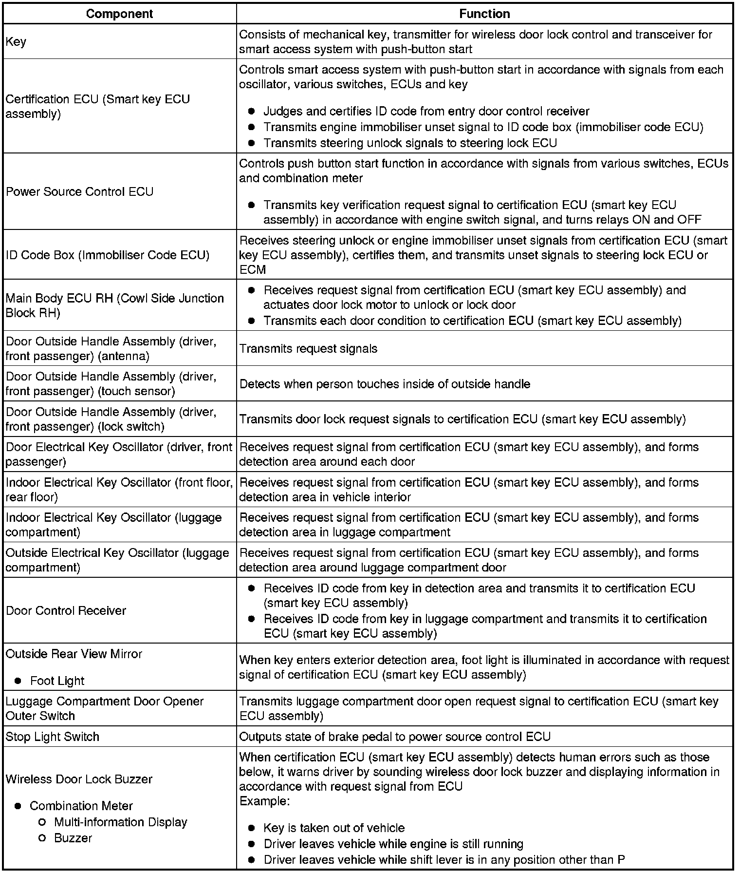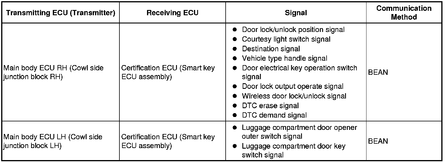 This system is controlled by the certification ECU (smart key ECU assembly). When the certification ECU (smart key ECU assembly) detects the presence of the smart access system with push-button start in one of the detection areas, it identifies and checks the ID code, and outputs operation signals to the related ECU in accordance with their functions.