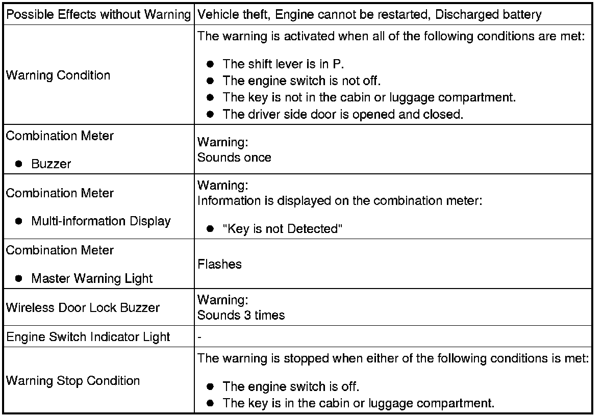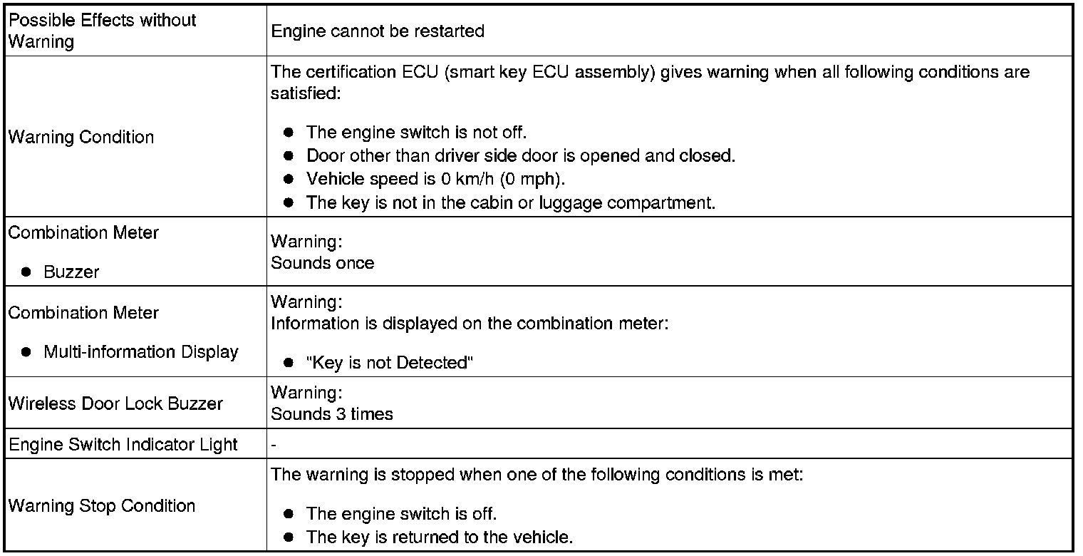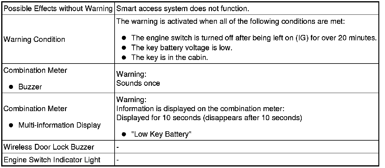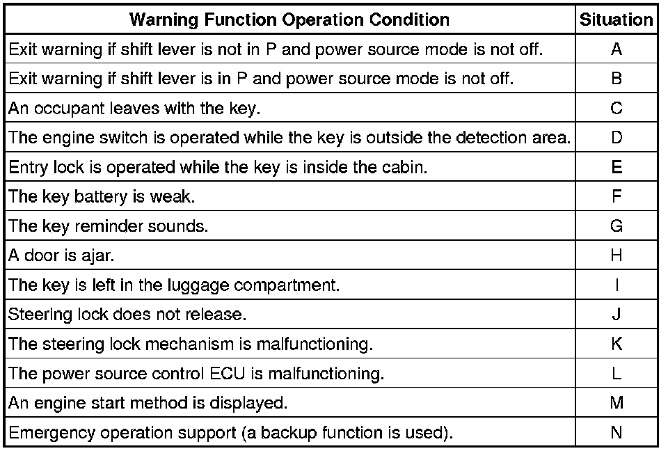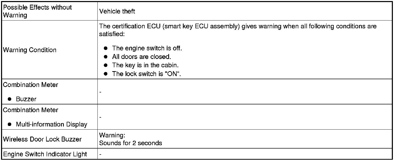 When any of the situations below occur, the smart access system with push-button start causes the certification ECU (smart key ECU assembly) to sound the buzzer in the combination meter and the wireless door lock buzzer, and illuminate the combination meter's multi-information display in order to alert the driver.