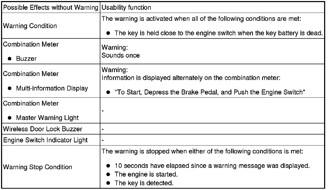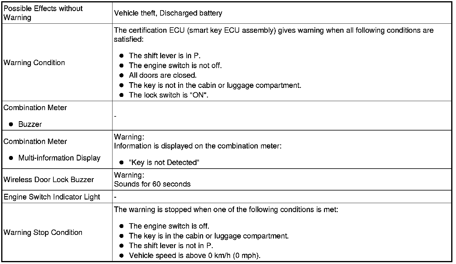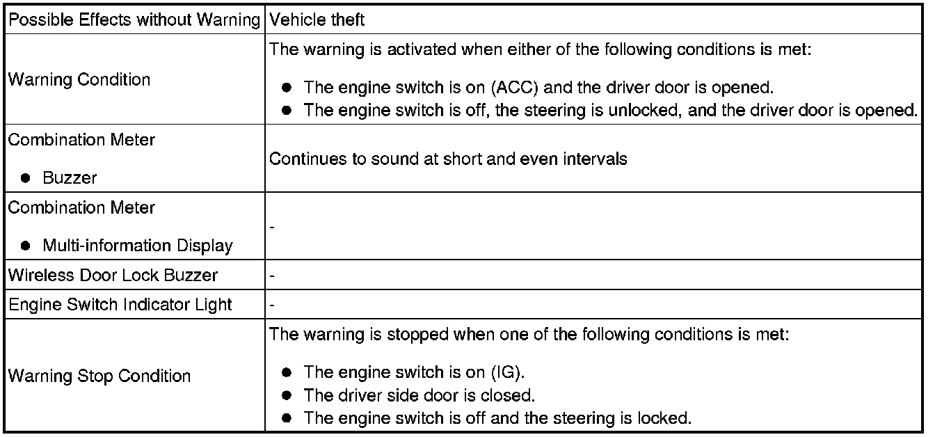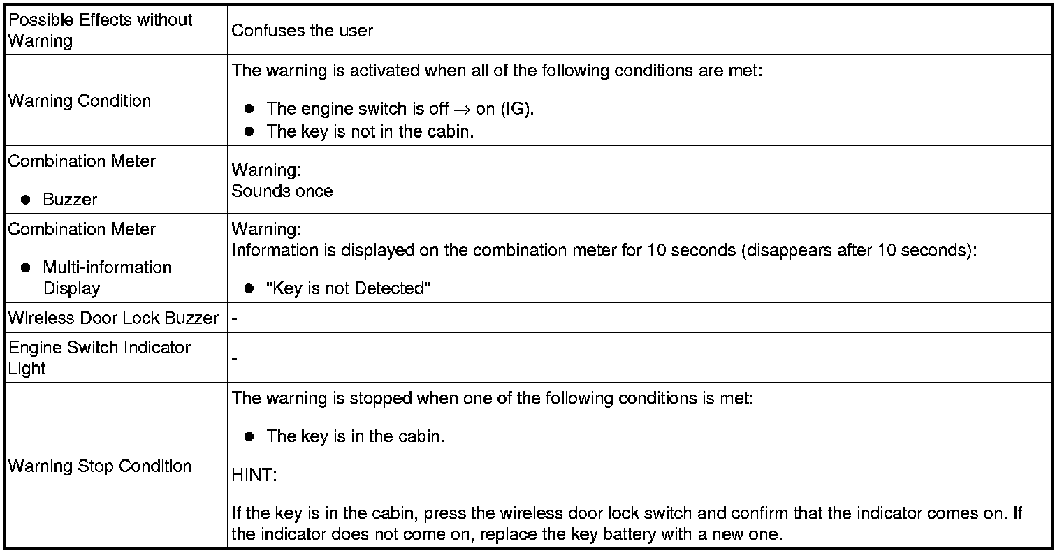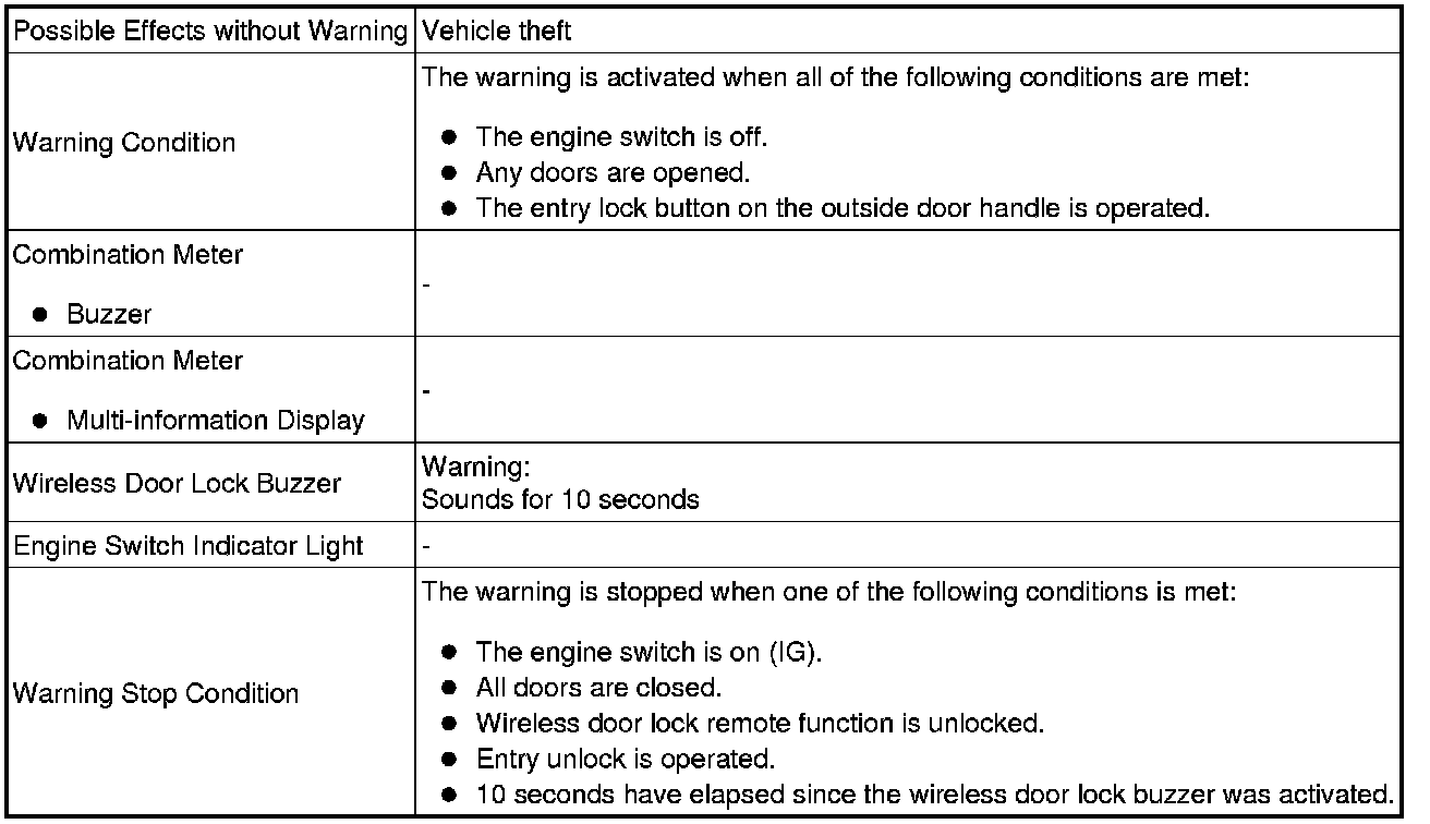 When any of the situations below occur, the smart access system with push-button start causes the certification ECU (smart key ECU assembly) to sound the buzzer in the combination meter and the wireless door lock buzzer, and illuminate the combination meter's multi-information display in order to alert the driver.