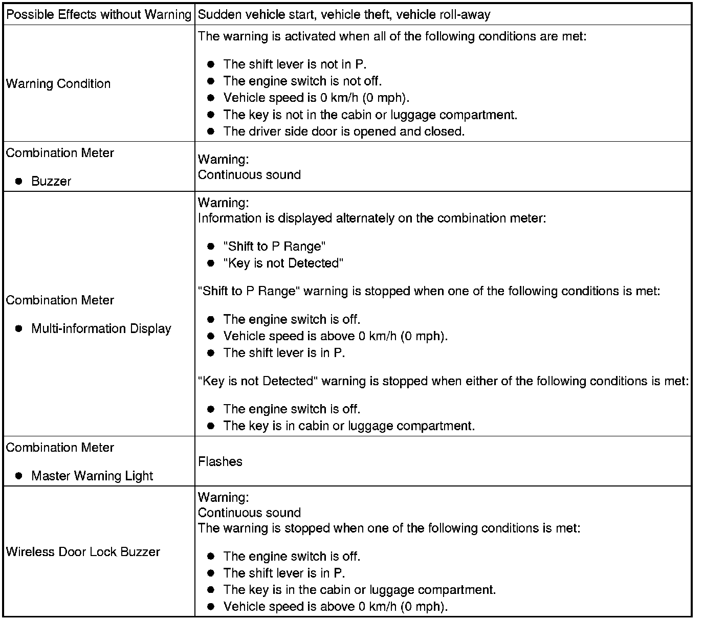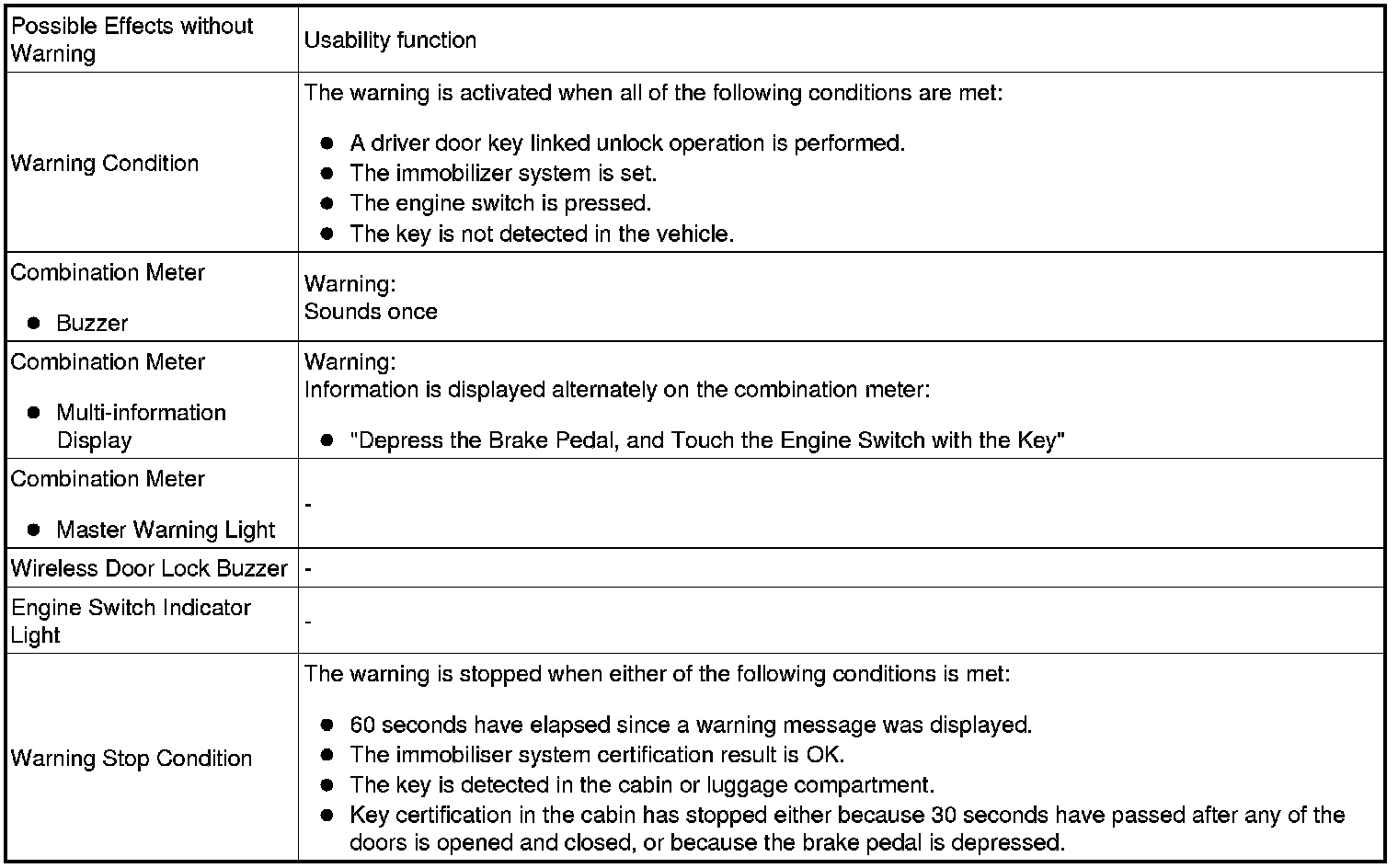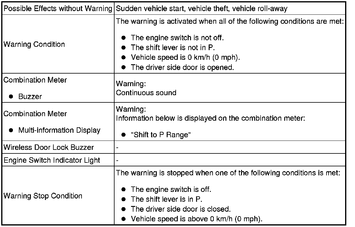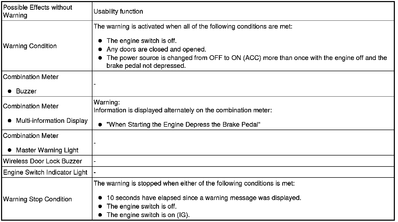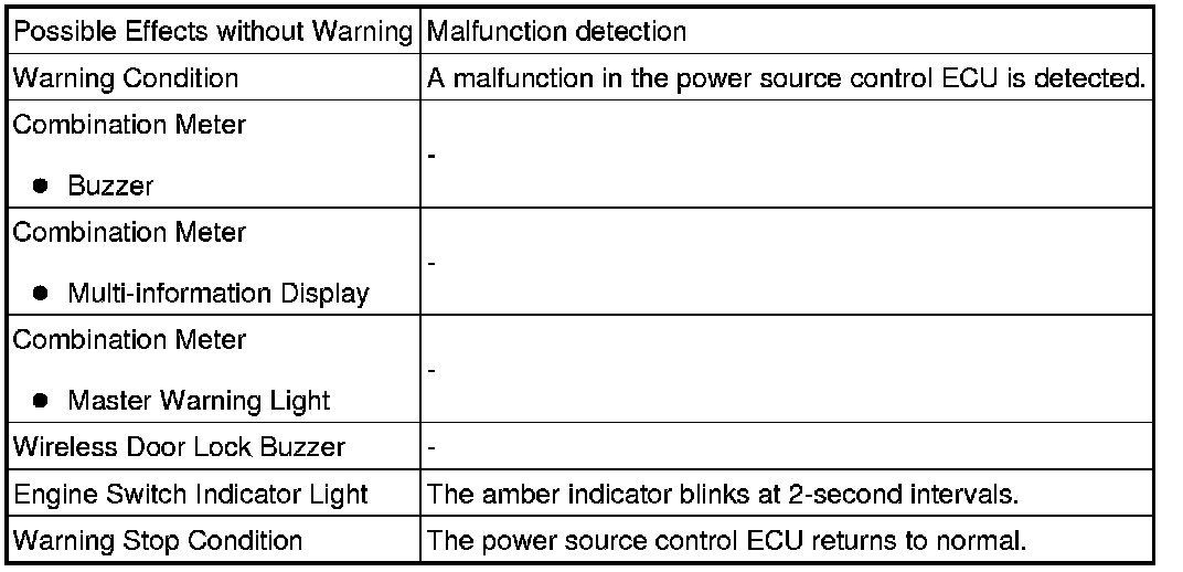When any of the situations below occur, the smart access system with push-button start causes the certification ECU (smart key ECU assembly) to sound the buzzer in the combination meter and the wireless door lock buzzer, and illuminate the combination meter's multi-information display in order to alert the driver.