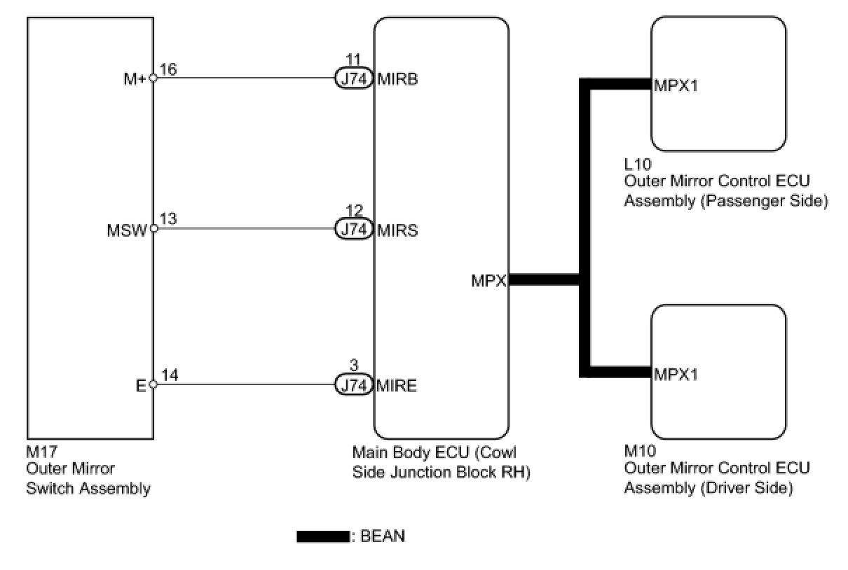 The outer mirror switch assembly sends information about the operating condition of the mirror switch (switch input signals) through the multiplex communication line. Then the switch input signals are sent to the outer mirror control ECU assembly.