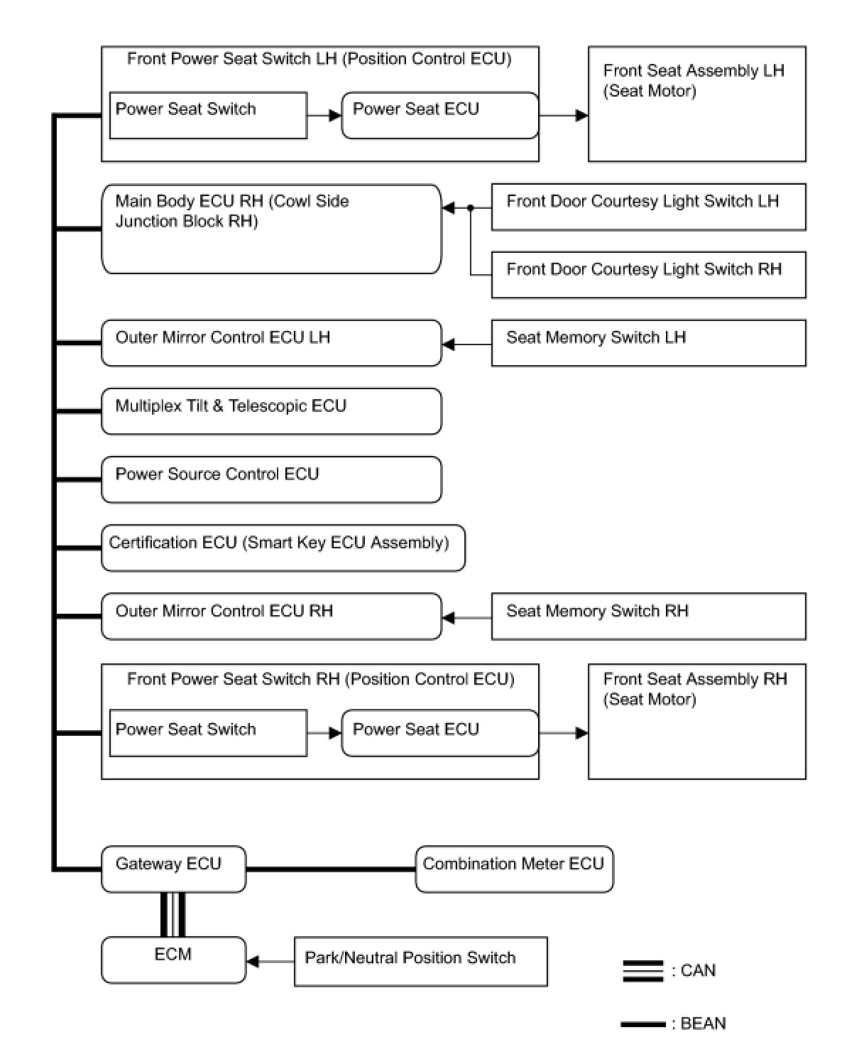 For the driver side memory function, the memory switch operation is first transferred from the outer mirror control ECU LH to the front power seat switch LH (position control ECU) via the multiplex communication line. For the passenger side memory function, the memory switch operation is first transferred from the outer mirror control ECU RH to the front power seat switch RH (position control ECU) via the multiplex communication line. Then, either the seat position is stored in memory or a previously stored seat position is recalled.
