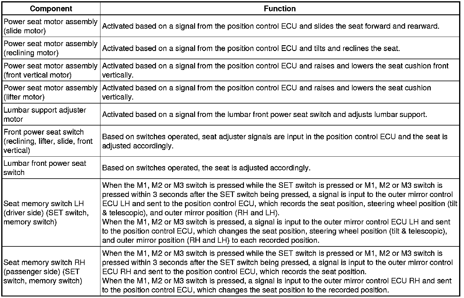 The memory system for the front seats is standard equipment. With the memory function, the front power seat switch (position control ECU) performs the following: 1) controls the slide, reclining, lifter, and front vertical motors; 2) memorizes the seat position; and 3) operates the seat restoring operation.