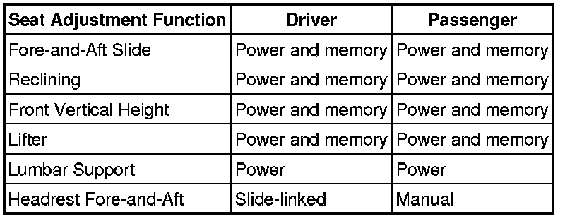 The front power seat adjustment and position memory are shown in the table below.