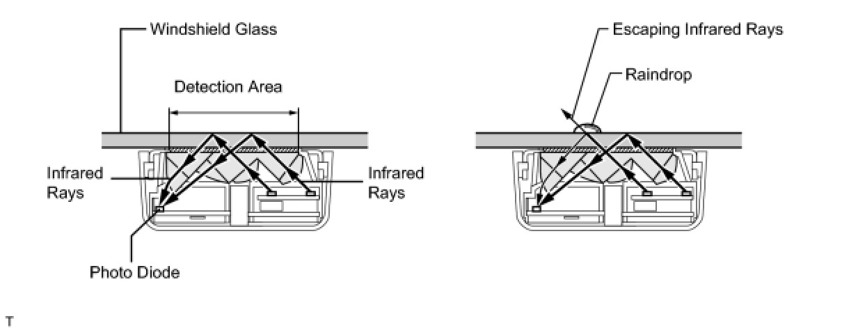 If raindrops are present in the detection area, a portion of the emitted infrared rays penetrates the windshield glass due to the change in the difference of the index of refraction between the glass and the area outside the windshield (difference between air and water). The ability of the windshield glass to reflect the emitted rays back inside change due to the presence of raindrops. This reduces the amount of infrared rays that are received by the photo diode. The amount of this reduction is then used to determine the amount of raindrops. Thus, this function selects the INT, LO, and HI wiper operation in order to operate the wipers at an optimal speed and timing.