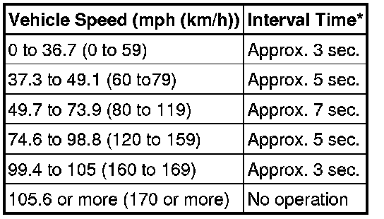(3) As shown in the following table, the wiper operates once more after an interval time (between 3 to 7 seconds) determined based on the vehicle speed so that any washer fluid drips are wiped away. The speed signal used for this function is sent by the combination meter, and received by the main body ECU LH.