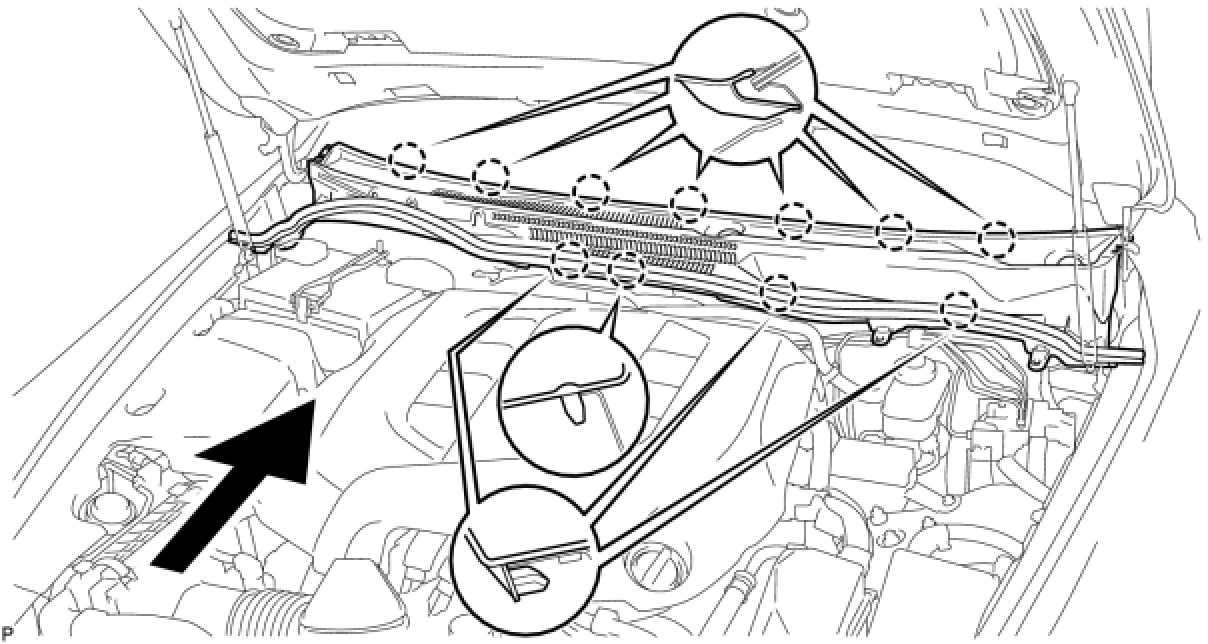 (b) Engage the clip on the rubber portion of the cowl top ventilator louver sub-assembly with the front upper fender protector LH.