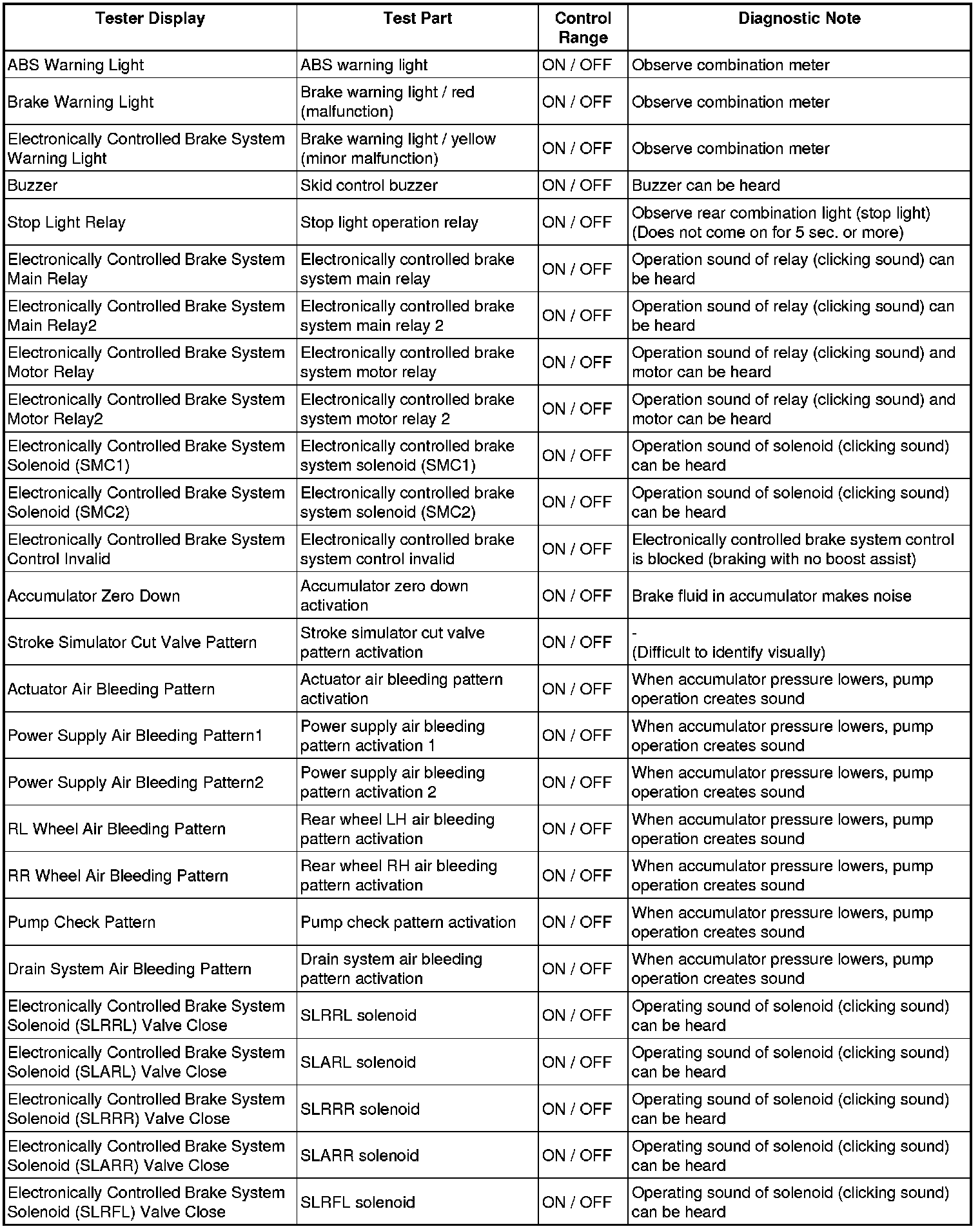 * The Active Tests of the ABS solenoid, ABS motor relay, ABS warning light and brake warning light / red (malfunction) are available when the vehicle is stopped.
