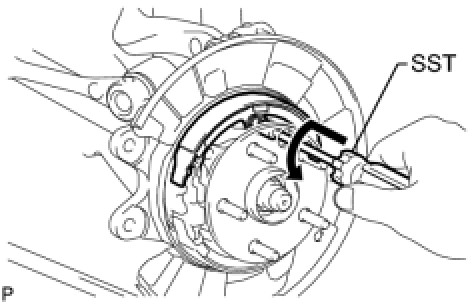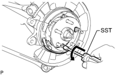 (a) Using SST, install the No. 2 parking brake shoe with the No. 2 shoe hold down spring cup, No. 2 compression spring and No. 1 shoe hold down spring pin.