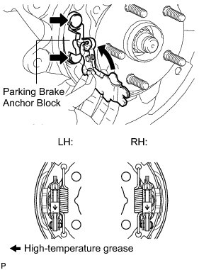 (a) Apply a light coat of high-temperature grease to the area where the parking brake shoe lever contacts the parking brake anchor block.