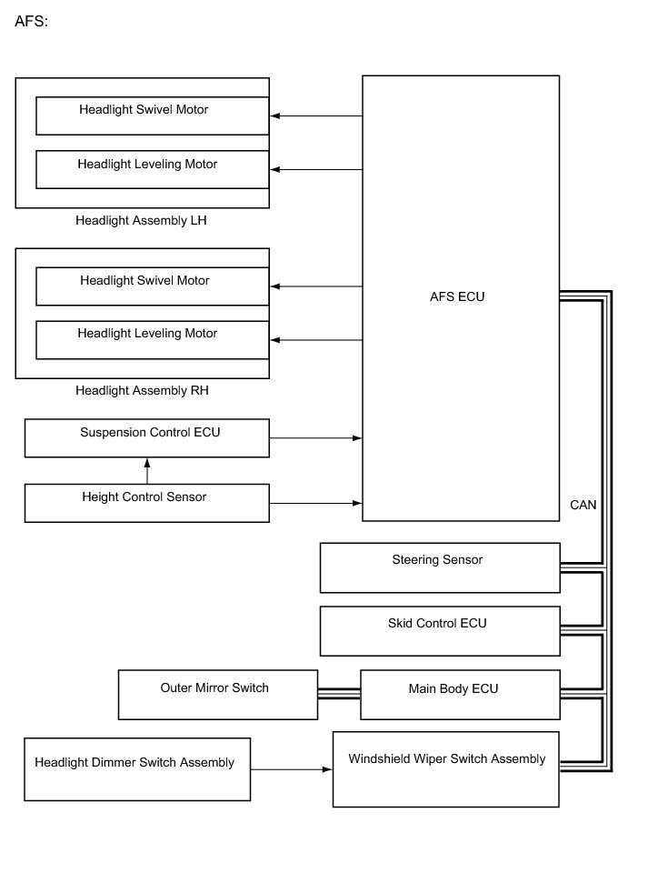 On models without the air suspension system, the AFS ECU calculates changes in the vehicle posture based on the signals from the height control sensor (front and rear) and each ECU.