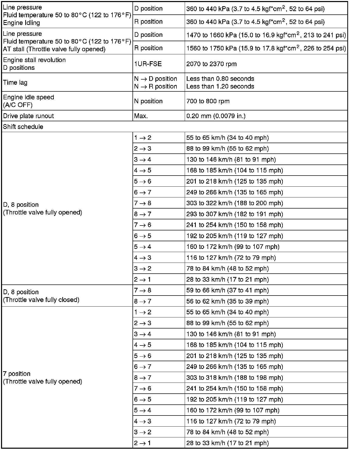 SERVICE SPECIFICATIONS: AA80F AUTOMATIC TRANSMISSION: SERVICE DATA