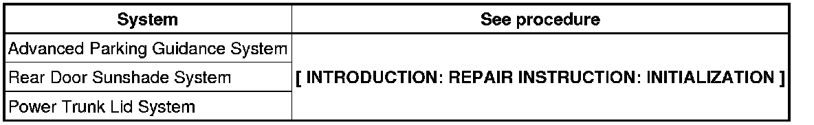 When disconnecting the cable from the negative (-) battery terminal, initialize the following systems after the cable is reconnected.
