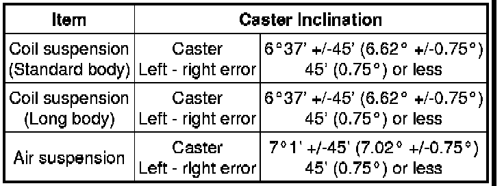 If the caster and steering axis inclination are not within the specified values, after the camber has been correctly adjusted, recheck the suspension parts for damaged and/or worn out parts.