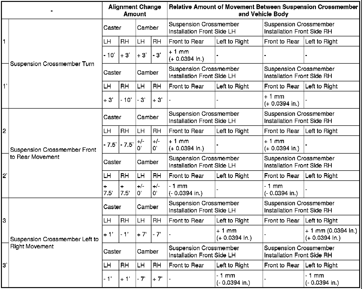 Relative alignment change based on amount of suspension crossmember movement in each direction:
