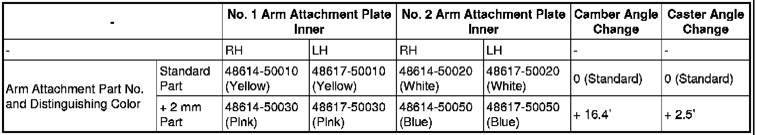 (a) If the front suspension crossmember's left to right camber value is not as specified even though the camber and caster adjustment was performed, replace the No. 1 arm attachment plate inner and No. 2 arm attachment plate inner. Then perform the camber adjustment again.