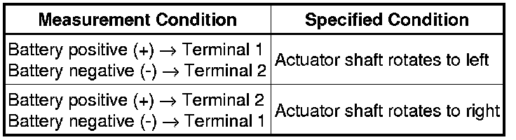 (a) When battery voltage is applied between terminals 1 and 2 of the connector, check the operation of the actuator shaft.